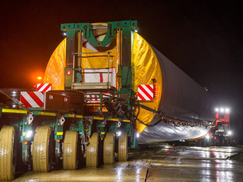Damit die Großkomponenten, die bis zu 110 Tonnen schwer sind, (Stahlturmteile, Nabe, Maschinenhause, Antriebsstrang) den Weg auf unsere Baustelle finden können, mussten in den letzten Monaten einige logistische Hürden genommen werden.