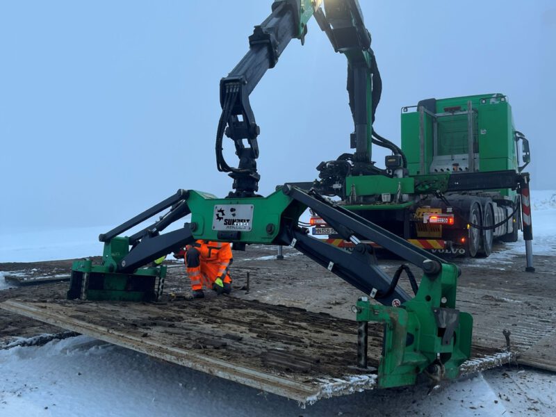 So wurden über 2.500 Platten unter winterlichen Bedingungen im Januar verlegt. Sie dienen als temporäre Straßen für die Umfahrung des Ortes, als Kranauslegerflächen und für mehrere Kurvenabschnitte und parallel verlegte Teile der Landstraße.