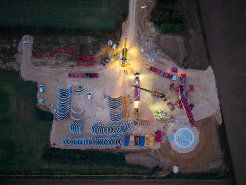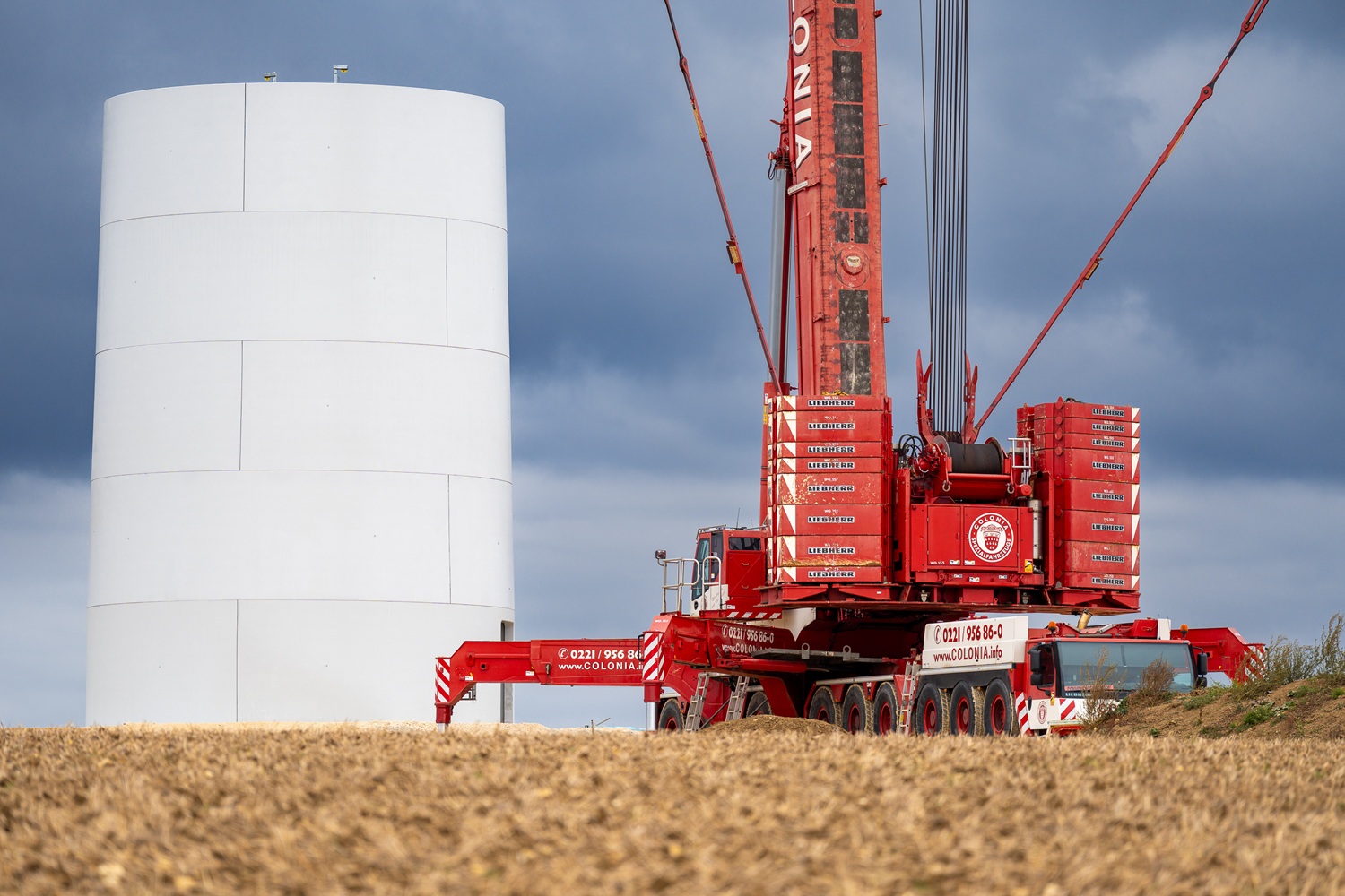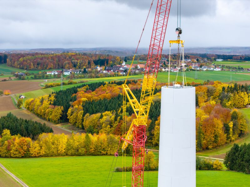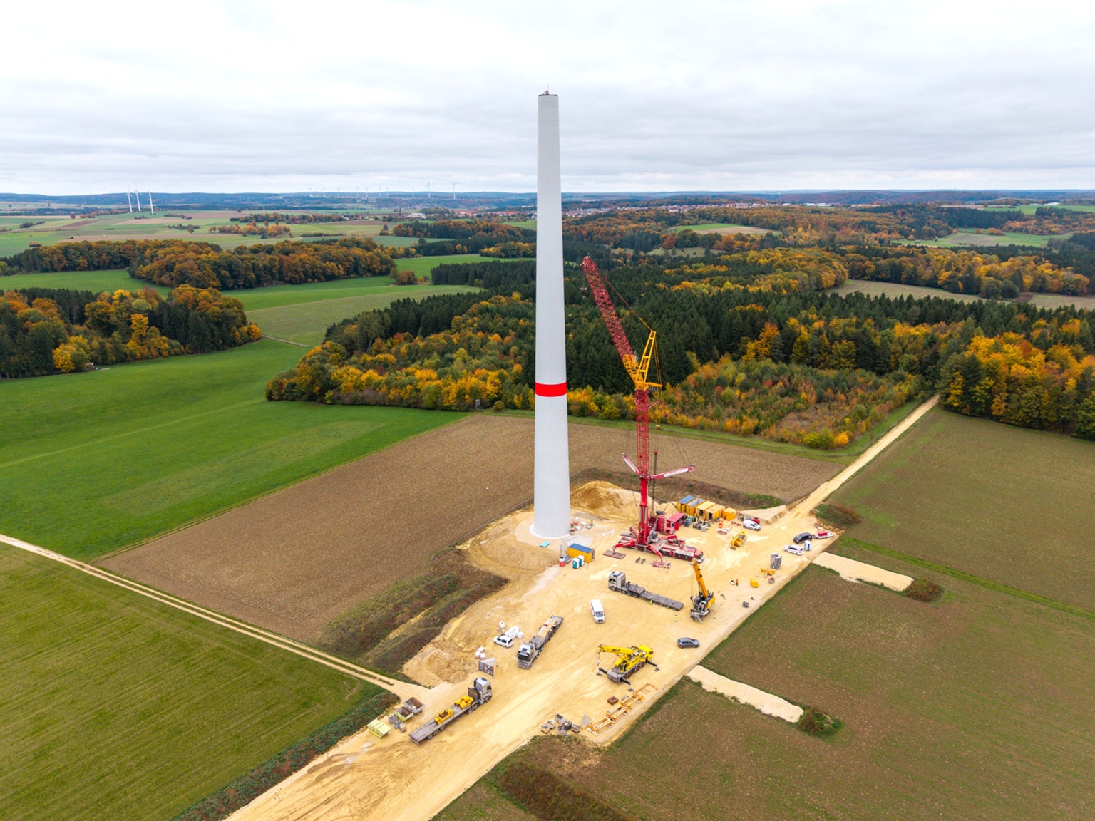 Parallel zum Rückbau starteten bereits die vorbereitenden Tiefbaumaßnahmen für die drei neu zu errichtenden Windenergieanlagen. Hierbei wurden die bereits vorhandenen Zuwegungsbereiche – wo notwendig – verbessert und die erforderlichen Kranstell- und Montageflächen hergestellt. Im Zeitraum von August – Oktober 2025 wurden die Fundamente der einzelnen Anlagen errichtet. Aktuell läuft bereits die Errichtung des Betonturmes, der ca. die Hälfte der finalen Nabenhöhe ausmacht.