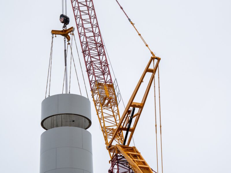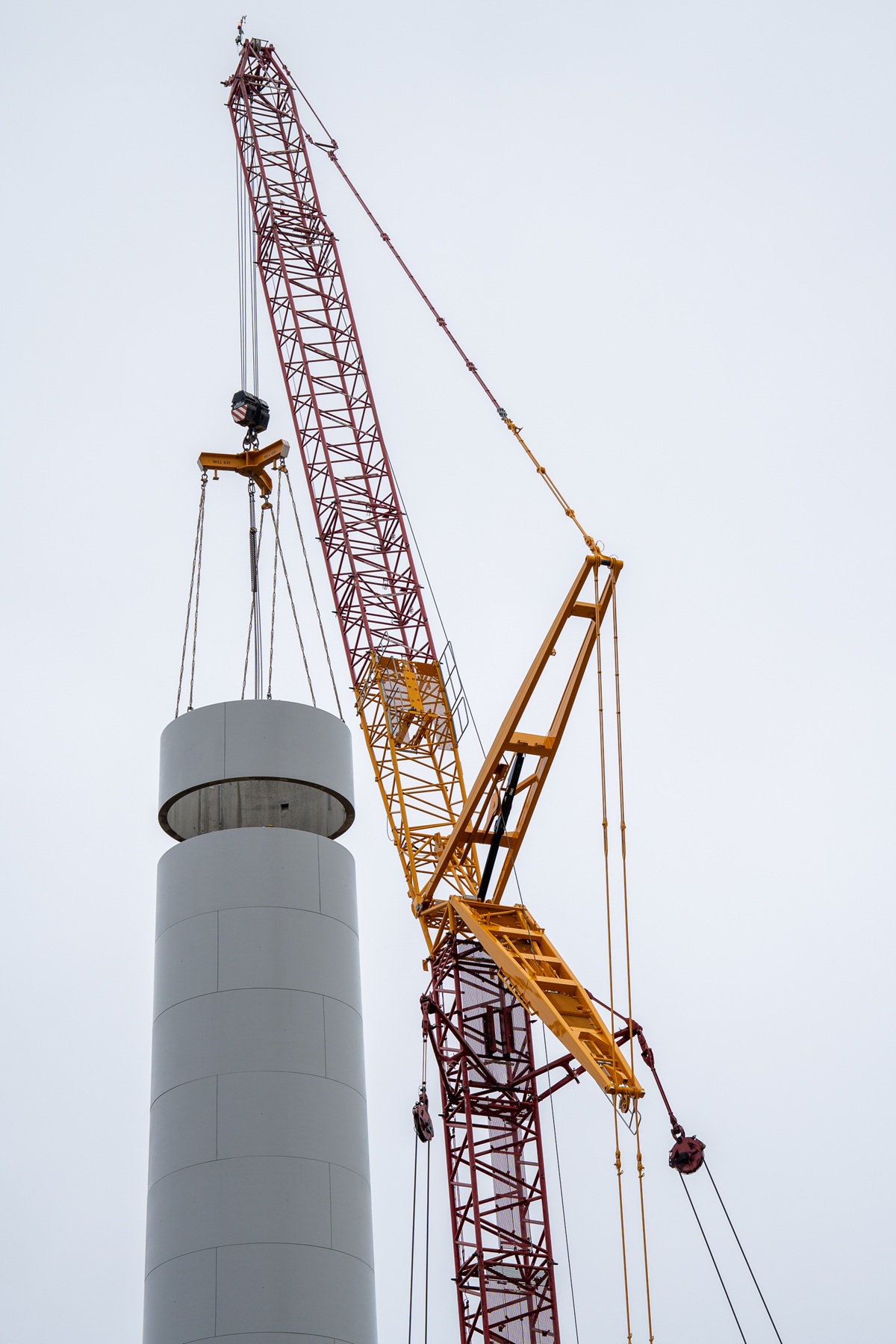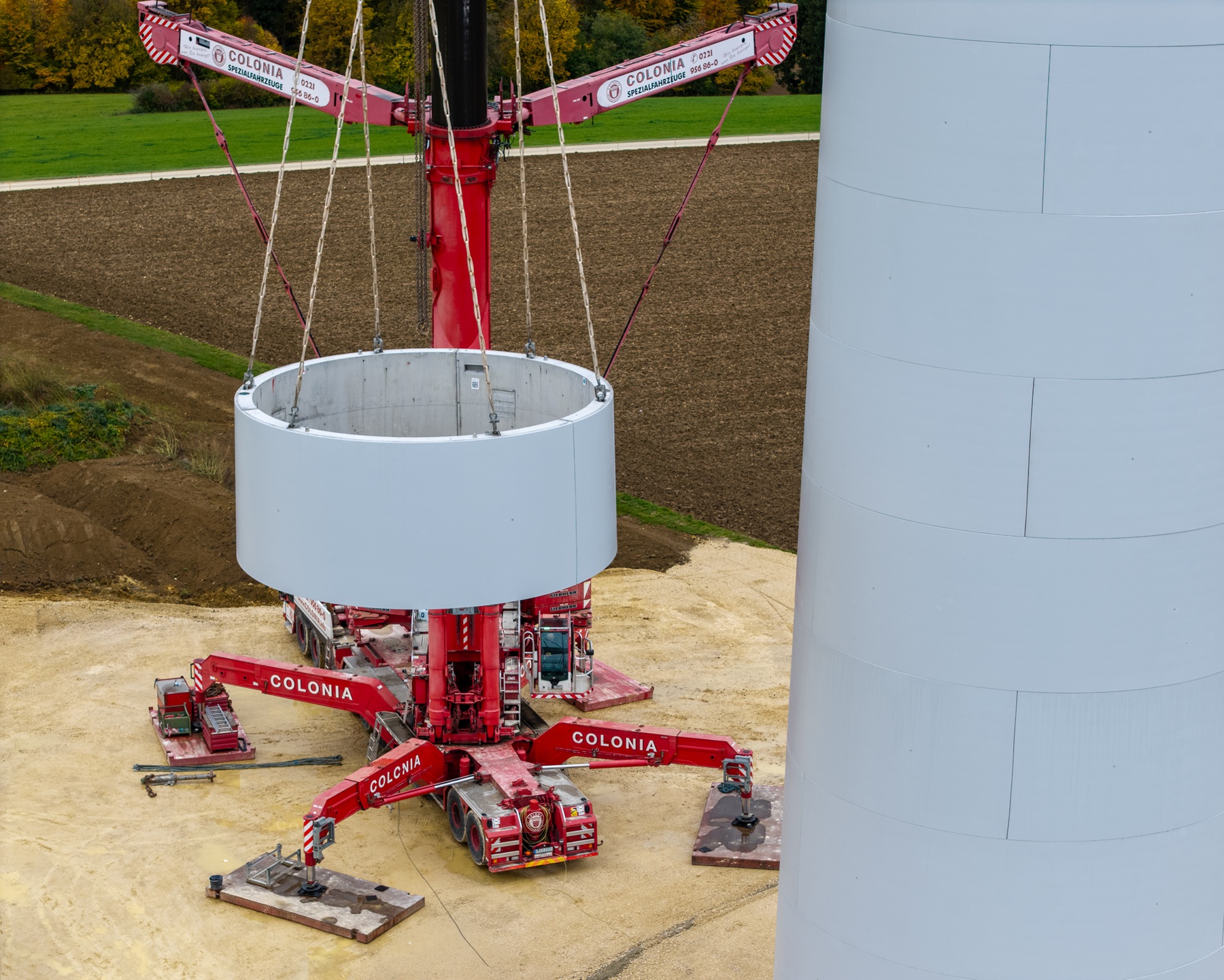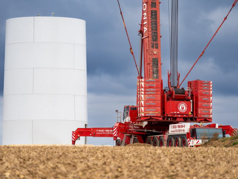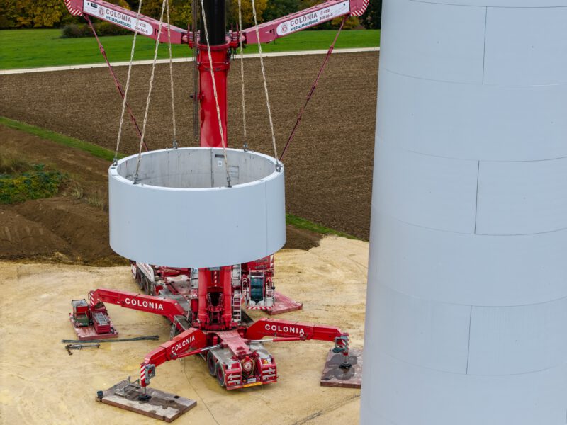 Parallel zum Rückbau starteten bereits die vorbereitenden Tiefbaumaßnahmen für die drei neu zu errichtenden Windenergieanlagen. Hierbei wurden die bereits vorhandenen Zuwegungsbereiche – wo notwendig – verbessert und die erforderlichen Kranstell- und Montageflächen hergestellt. Im Zeitraum von August – Oktober 2025 wurden die Fundamente der einzelnen Anlagen errichtet. Aktuell läuft bereits die Errichtung des Betonturmes, der ca. die Hälfte der finalen Nabenhöhe ausmacht.